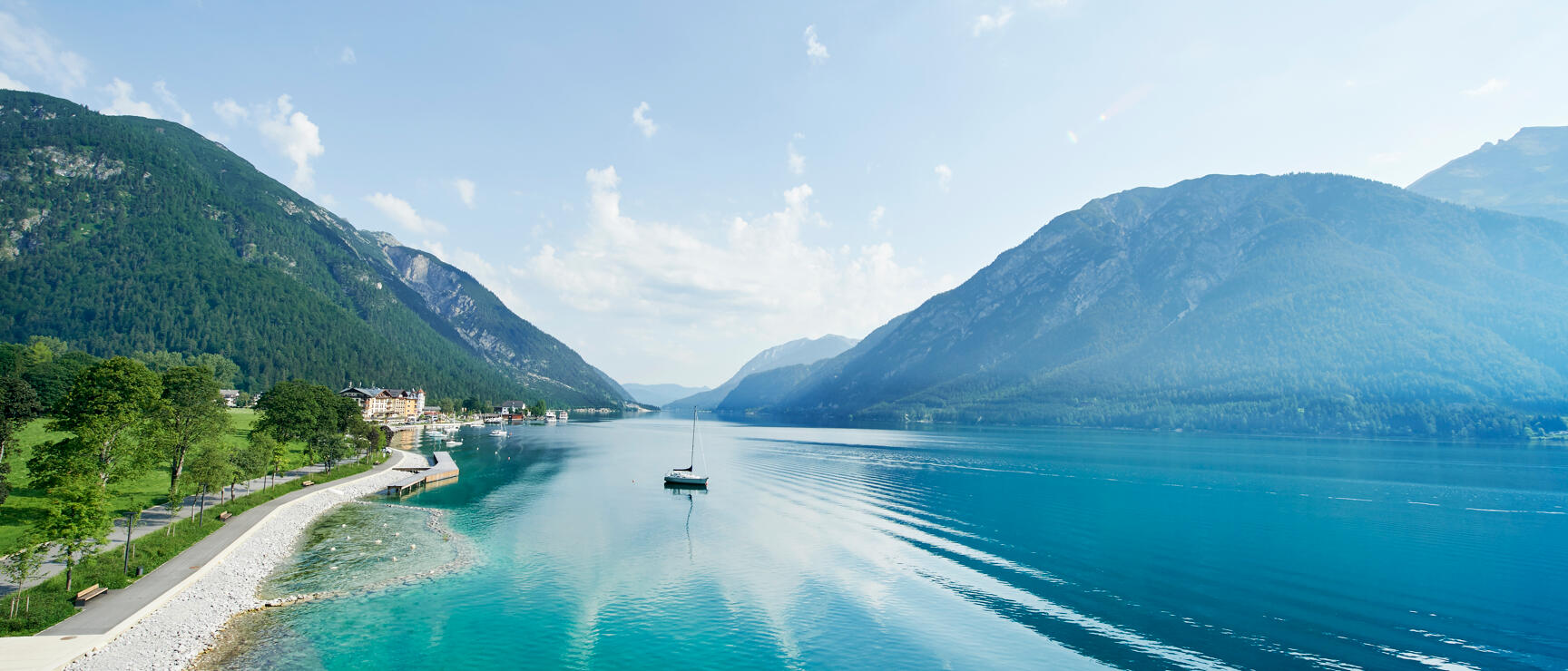 Když se smaragdově zelená hladina třpytí na slunci a skrze průzračnou vodu dohlédnete až do hloubky 10 metrů, je pohled na jezero Achensee mimořádným zážitkem. Přírodní zážitek dotvářejí dvě horská pásma – pohoří Rofan a Národní park Karwendel, která obklopují Achensee jako ochranný val.