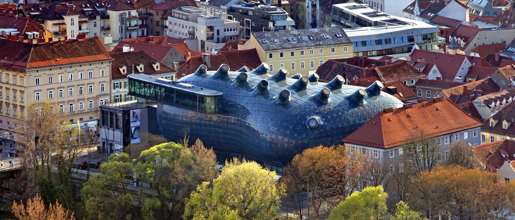 Obyvatelé Grazu museum Kunsthaus Graz láskyplně nazývají "Přátelský mimozemšťan". Do města spadl jako obrovská kapka v roce 2003, kdy byl Graz Evropským hlavním městem kultury. Stal se moderní dominantou univerzitního města a září jak svým kontroverzním exteriérem, tak vnitřními hodnotami svých expozic. Návštěvníci si mohou hodinovou věž na Schlossbergu prohlédnout skrze jednu z tzv. trysek - chobotovitých otvorů. Architekti tak záměrně vytvořili spojnici mezi dvěma nejvýznamnějšími památkami města. Světelná a mediální fasáda směrem do centra města umožňuje umělcům a kurátorům interaktivně komunikovat s městským prostorem.