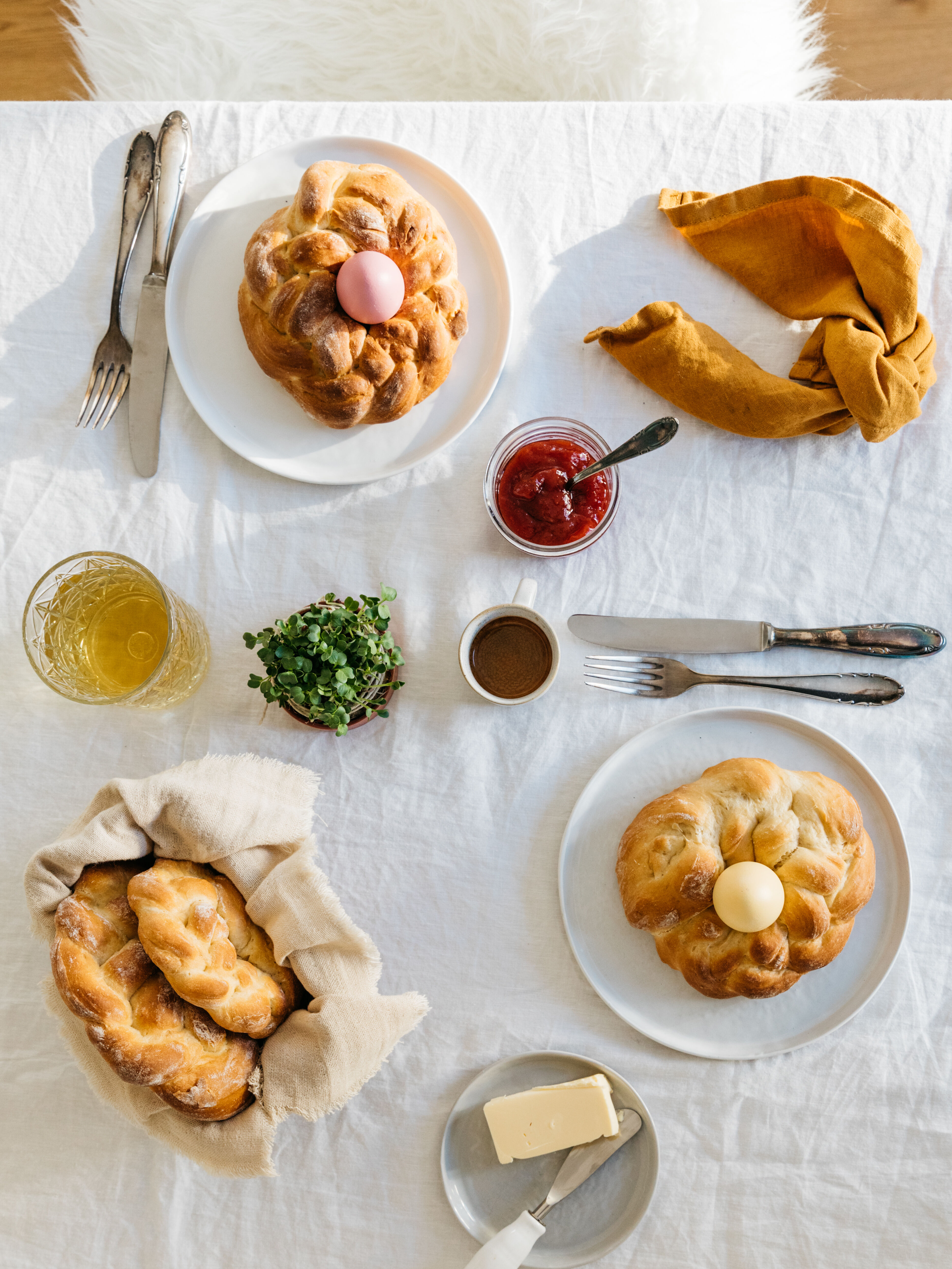 Nach dem Backen abkühlen lassen. Vor dem Servieren in der Mitte ein Osterei platzieren und mit Butter und Marmelade genießen.