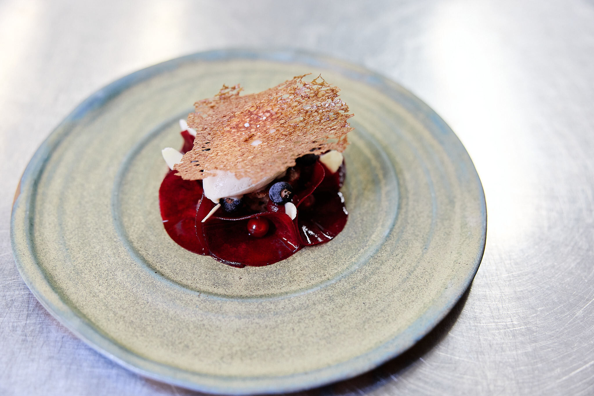 Der „älteste” süße Torten-Klassiker Österreichs bekommt vom Restaurant Rossbarth in Linz ein fruchtiges Update, serviert mit roter Rübe und Nougat-Zimt-Eis.