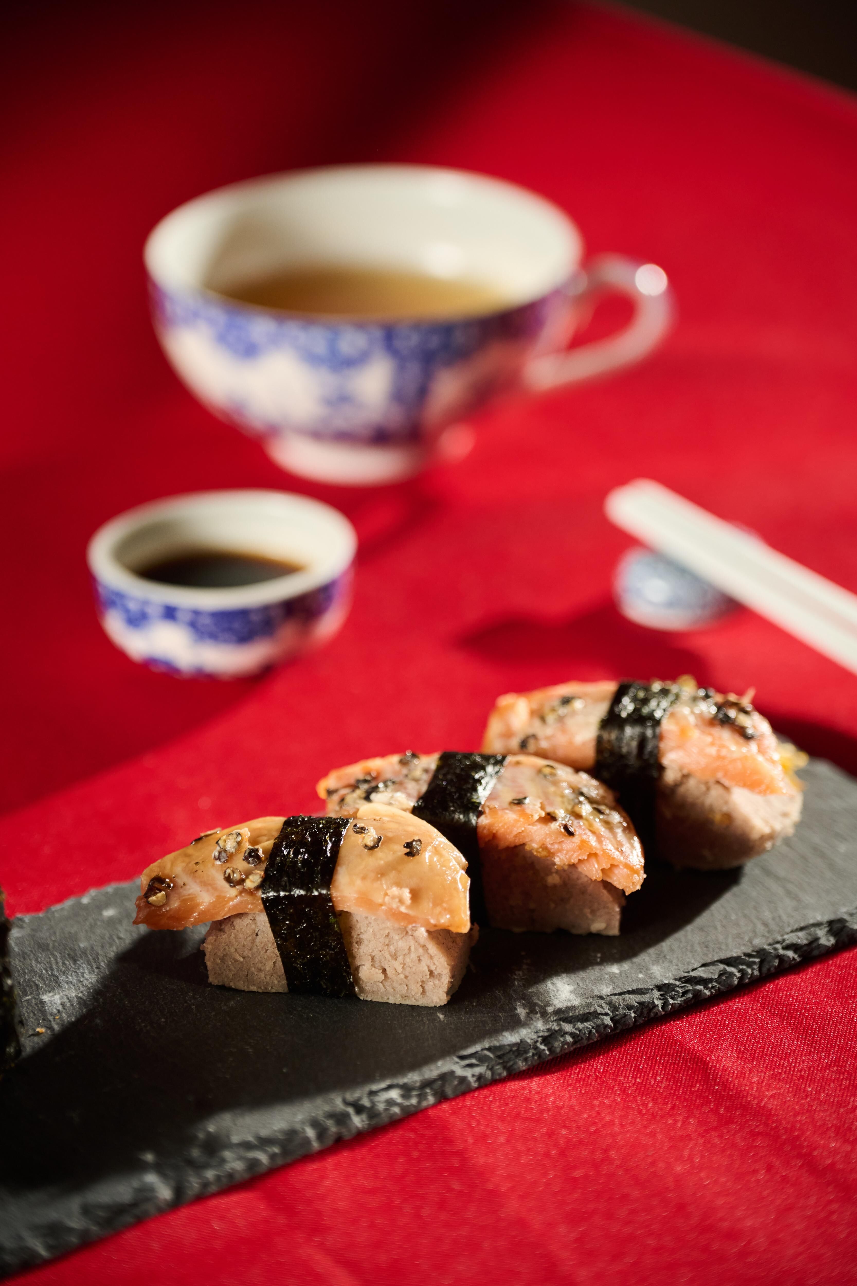 Abschließend wird um das Sterz Sushi ein Noribändchen gelegt und auf der Unterseite fixiert.
