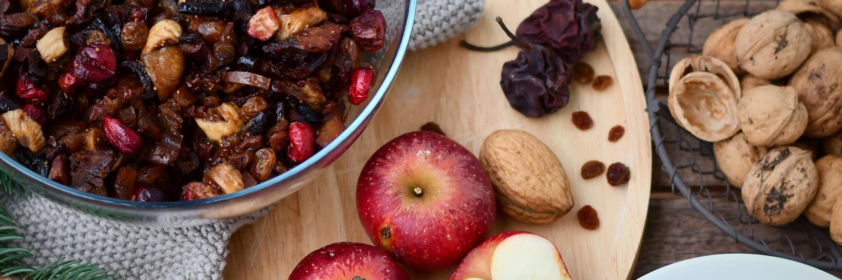 Tagliare finemente tutta la frutta secca e mescolarla con miele, rum e acqua tiepida. Lasciare riposare coperto durante la notte affinché si insaporisca.