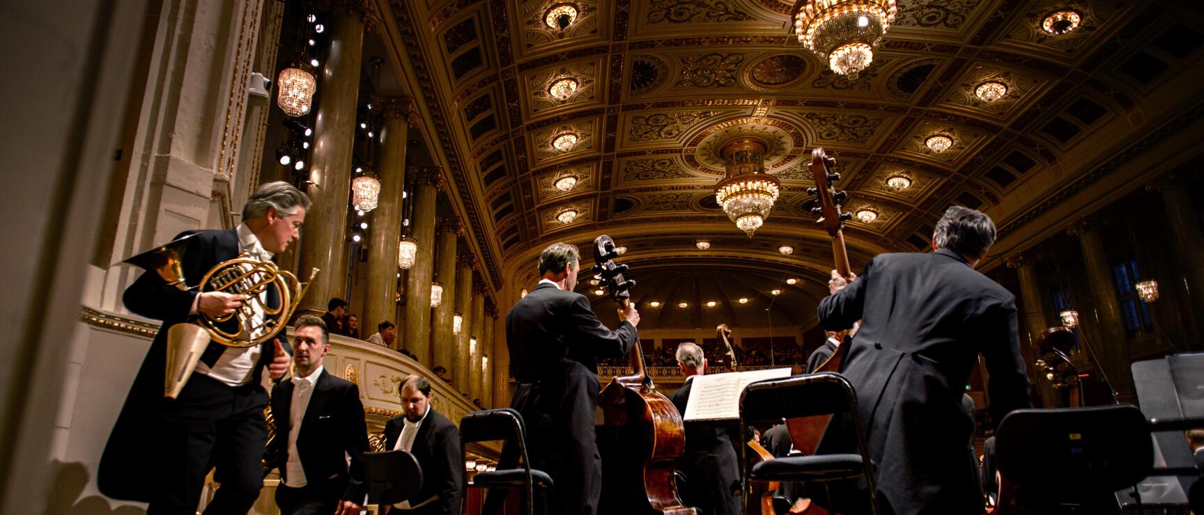 黄金に輝くゴールデナー・ザール(大ホール)は、世界で最高の音響効果をもつコンサートホールとして有名で、元旦のウィーン・フィルのニューイヤーコン サート会場です。小ホールは「ブラームス・ザール」などがあります。資料室・図書館は、ウィーンで活躍した音楽家達の遺品や直筆楽譜、書簡、肖像画など貴童な資料を所蔵しています。