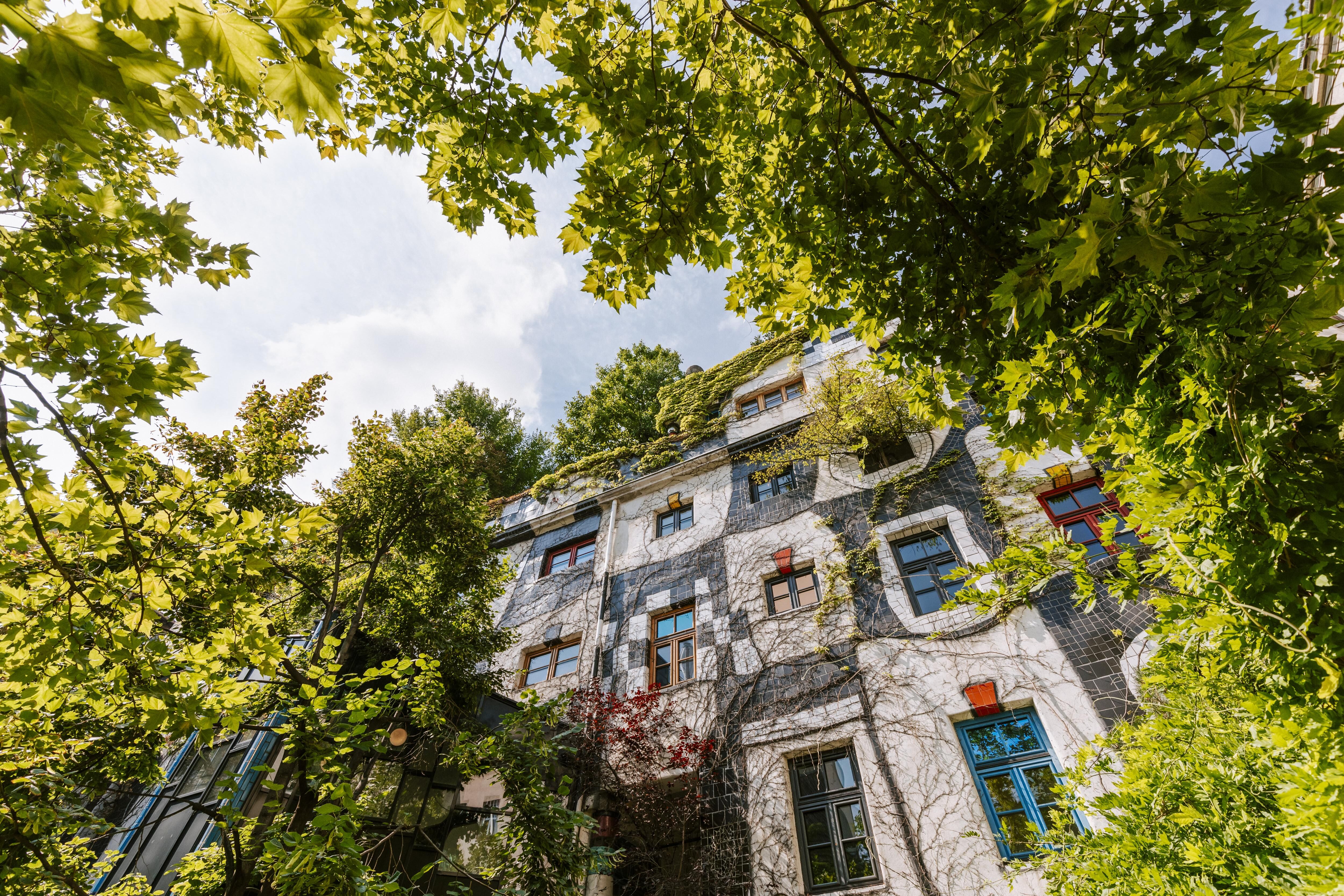 木が生えた窓、 心地よいファサード、 屋上に本物の森と本物のミツバチの巣、角やシャープな縁がないインテリアと美しい緑の中庭!1991年に創立された数々のユニークな特徴を持つクンスト・ハウス・ウィーン美術館は、芸術的で斬新な視点を提示しています。 美術館の設立によって街の中心にあるオアシスというフンデルトヴァッサーの夢が現実のものとなりました。 建物は彼の哲学に従って、閉鎖されていた既存のトーネット社の家具工場の建物を引き継ぎ、改修したものです。