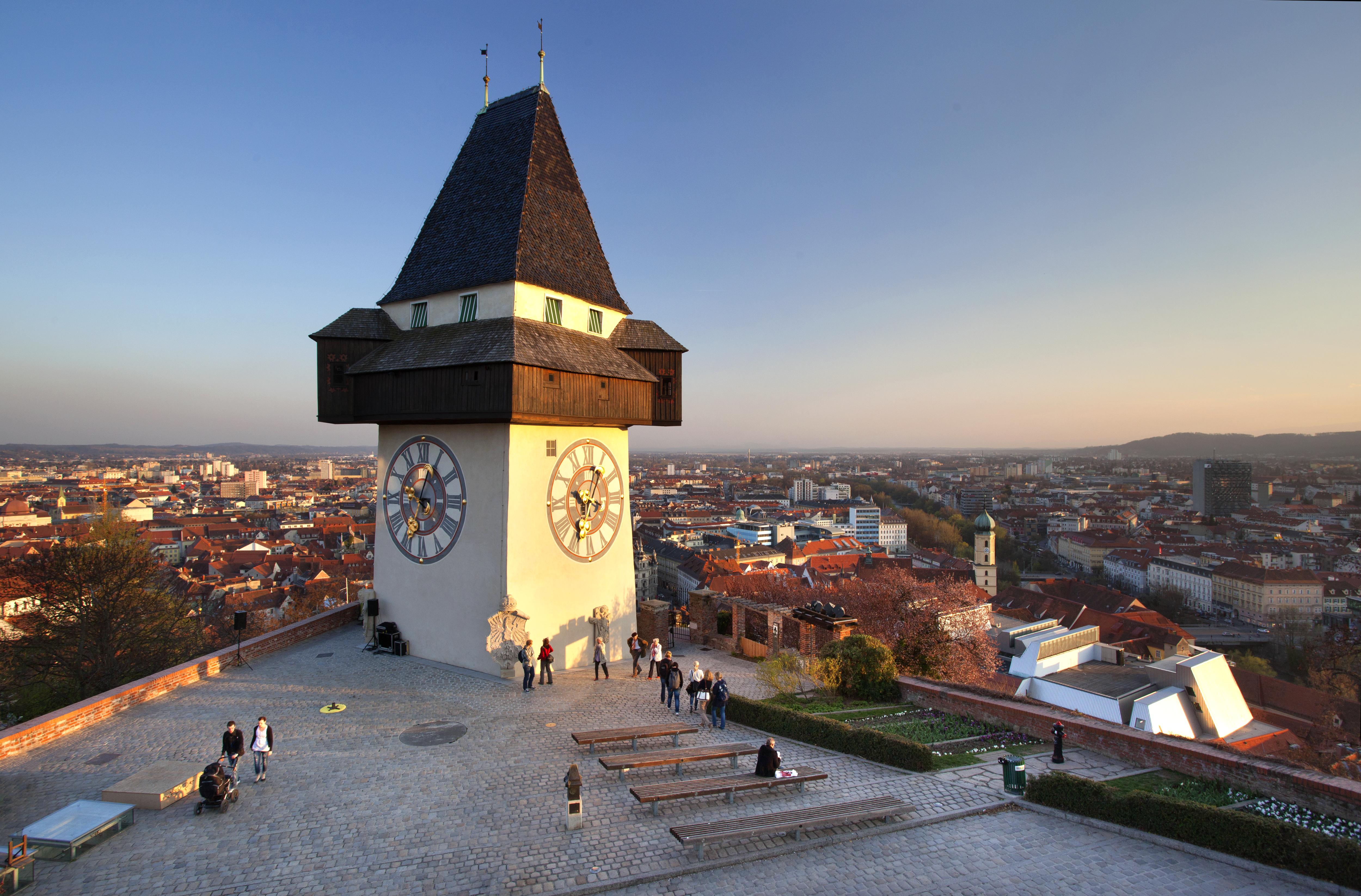 建築家のピーター・クックとコリン・フルニエがこの印象深い建物を設計し、2003年に建設しました。このムーア川のほとりに建つ新しい現代設計とシュロスベルク(城山)の古い時計塔が生み出す独特のコントラストは、この街の象徴であり、そして、建設的で緊張感溢れる伝統性と前衛性の関係を具現しています。