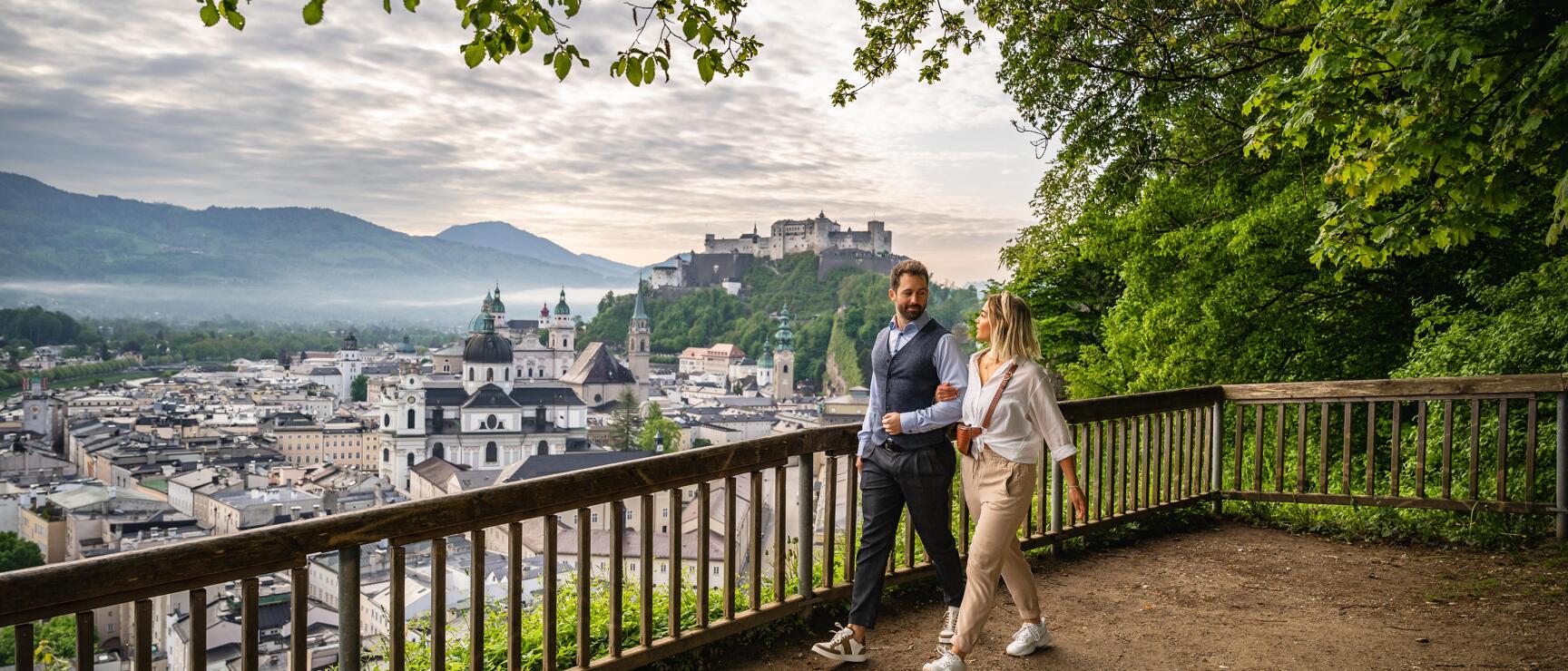 私は故郷のザルツブルクに帰れると、必ずメンヒスベルクを散策します。 ザルツァッハ川のほとりからモーツァルトシュテーク橋を渡り、市の中心部を抜け、市の山へと続く道は壮観であると同時に素晴らしいルートです。 旧市街の屋根を見下ろす位置まで上ると、自分が静寂に包まれていることに気付きます。