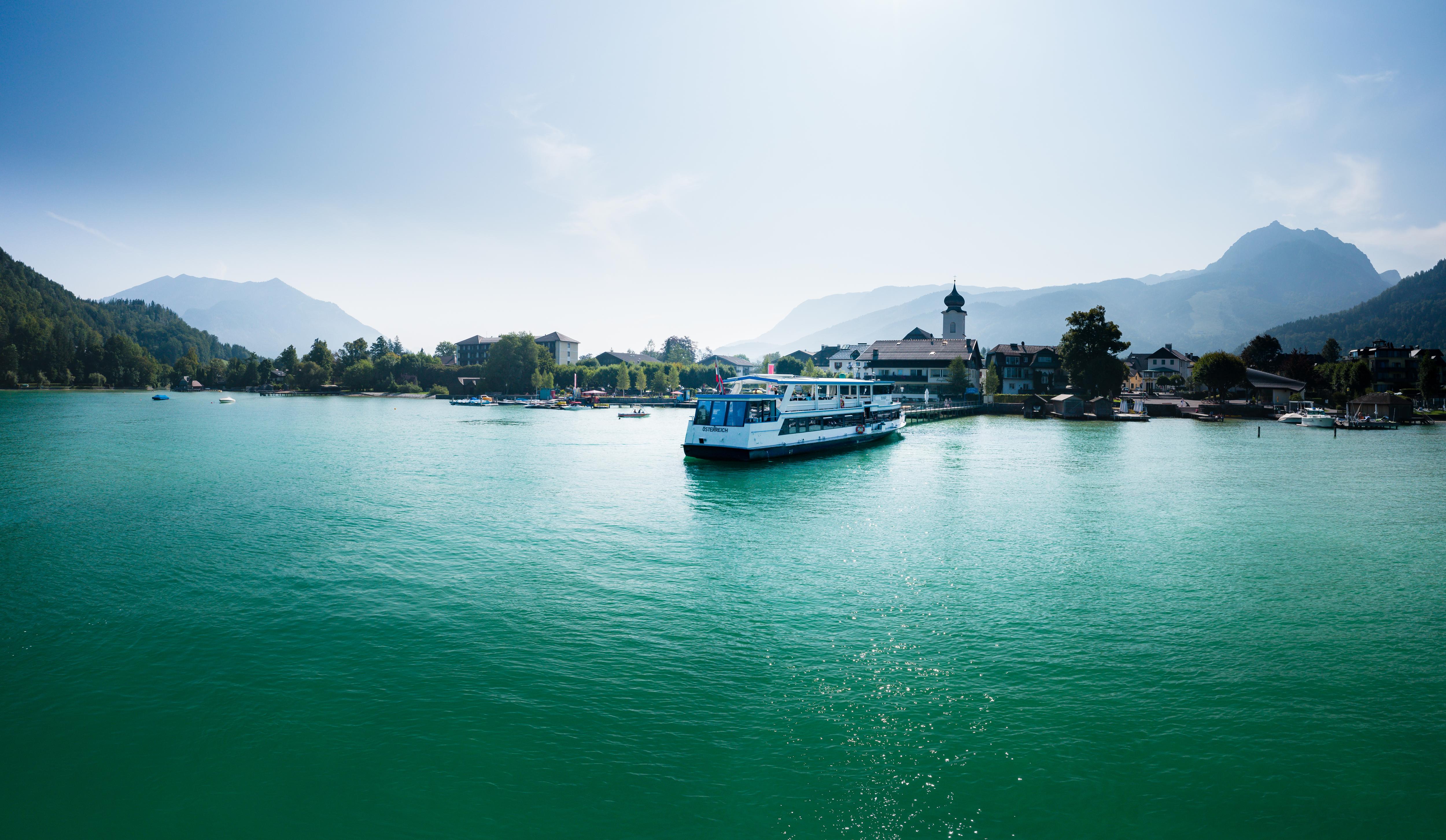 オーストリア・アルプスの湖水地方、ザルツカンマーグートにあるヴォルフガングゼー湖は、ザルツブルク州とオーバーエステライヒ州にまたがっています。 西暦800年初めに「アーバーゼー」(Abersee)という名前で記録に記載されたこの湖は、500年後、この地域を中世の巡礼地とした聖ヴォルフガングにちなんで「ヴォルフガングゼー」(Wolfgangsee)と改名されました。 何世紀にもわたってツィンケンバッハ(Zinkenbach)川の水がヴォルフガングゼー湖に流れ込み、現在はその優れた水質により「欧州連合の基準水」の地位を維持しています。 水中の多様な動植物の存在により、湖の色は様々で、美しい青緑色は石灰岩の結晶によって作られています。