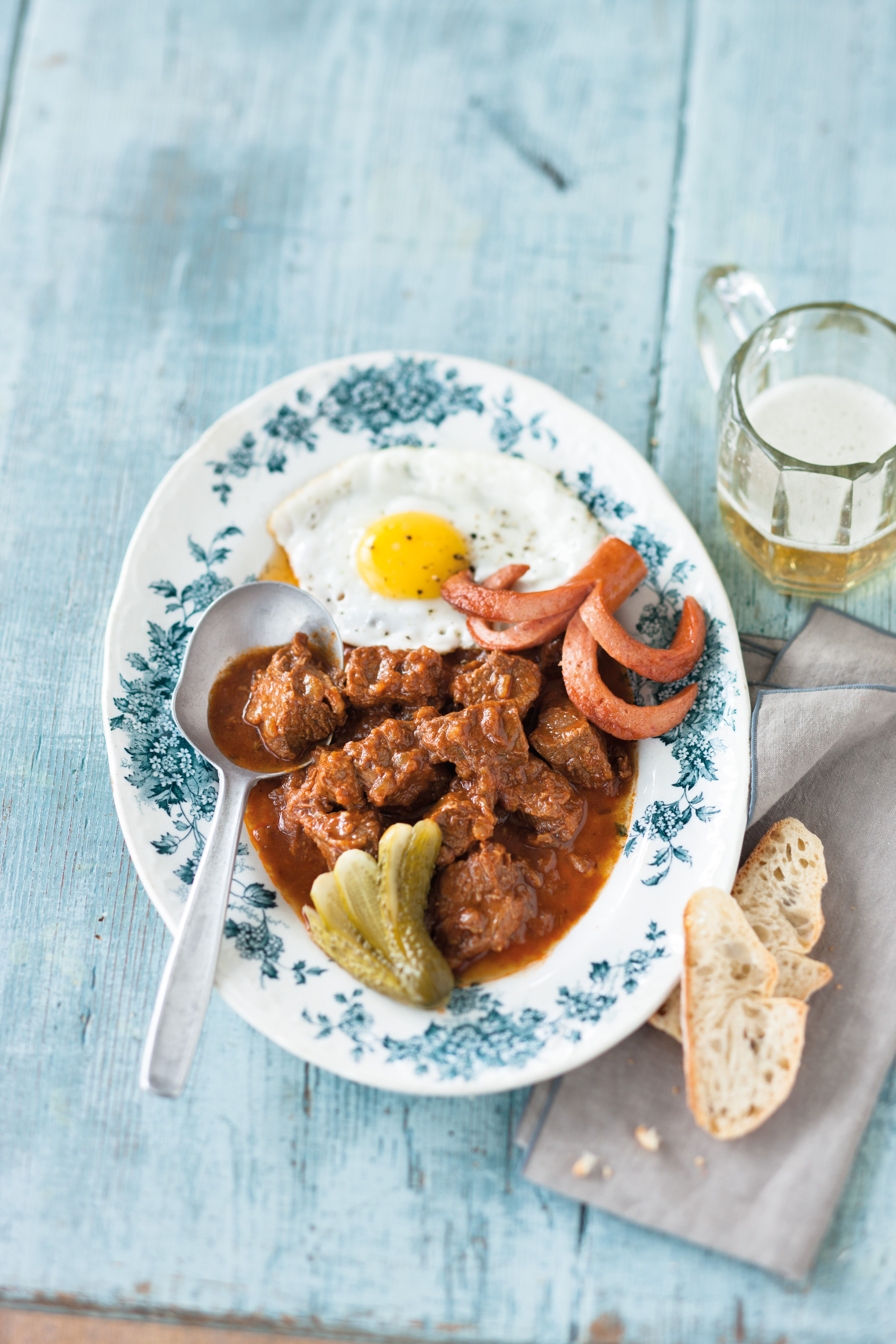 大きめの皿にグーラッシュを並べ、その上に熱々のソーセージをのせ、目玉焼きをのせる。扇形に切ったピクルスを添える。お好みで赤唐辛子の千切りを飾る。