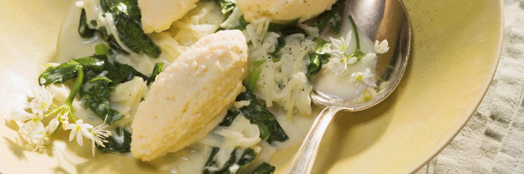 大さじ2杯の水を使って、チーズを混ぜた生地を団子状にし、塩を入れた湯で約10分間軽く煮る。水気を切る。