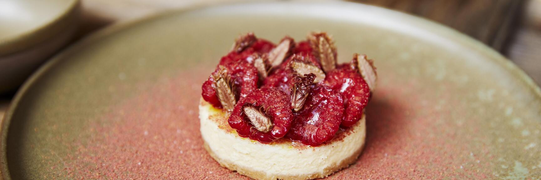 マリネしたラズベリーと、縦に半分に切ったカラマツの若芽をのせる。