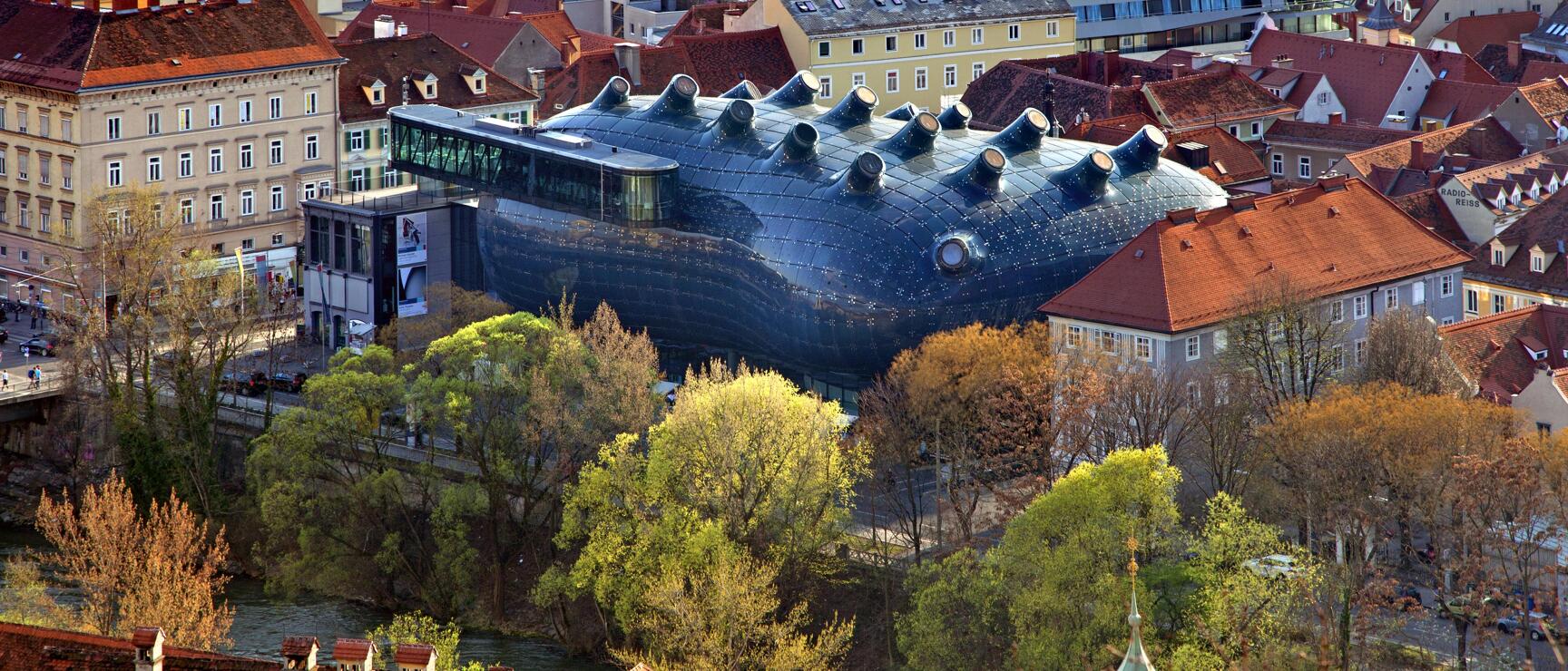 2003년 무어(Mur) 강 바로 오른쪽에 건립된 쿤스트하우스 그라츠(Kunsthaus Graz)는 거대한 파란색 거품이 떠다니는 것 같은 모습으로 그라츠의 새로운 랜드마크로 자리잡았습니다. 바다소의 촉수처럼 생긴 돌기가 슐로스베르크의 언덕 위의 시계탑과 교신하고 있다는 해석을 하는 사람들도 있습니다.