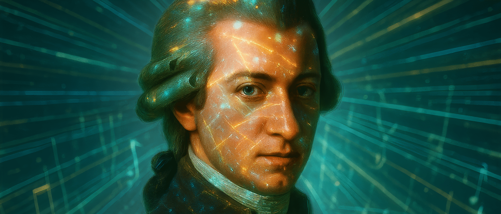 Świat dźwięków MYTHOS MOZART obejmuje zarówno wyszukane animacje 360°, które przenoszą słuchacza do historycznego Wiednia z 1791 roku, jak i imponujące wizualizacje stworzone przy użyciu sztucznej inteligencji na podstawie milionów danych dotyczących Mozarta.