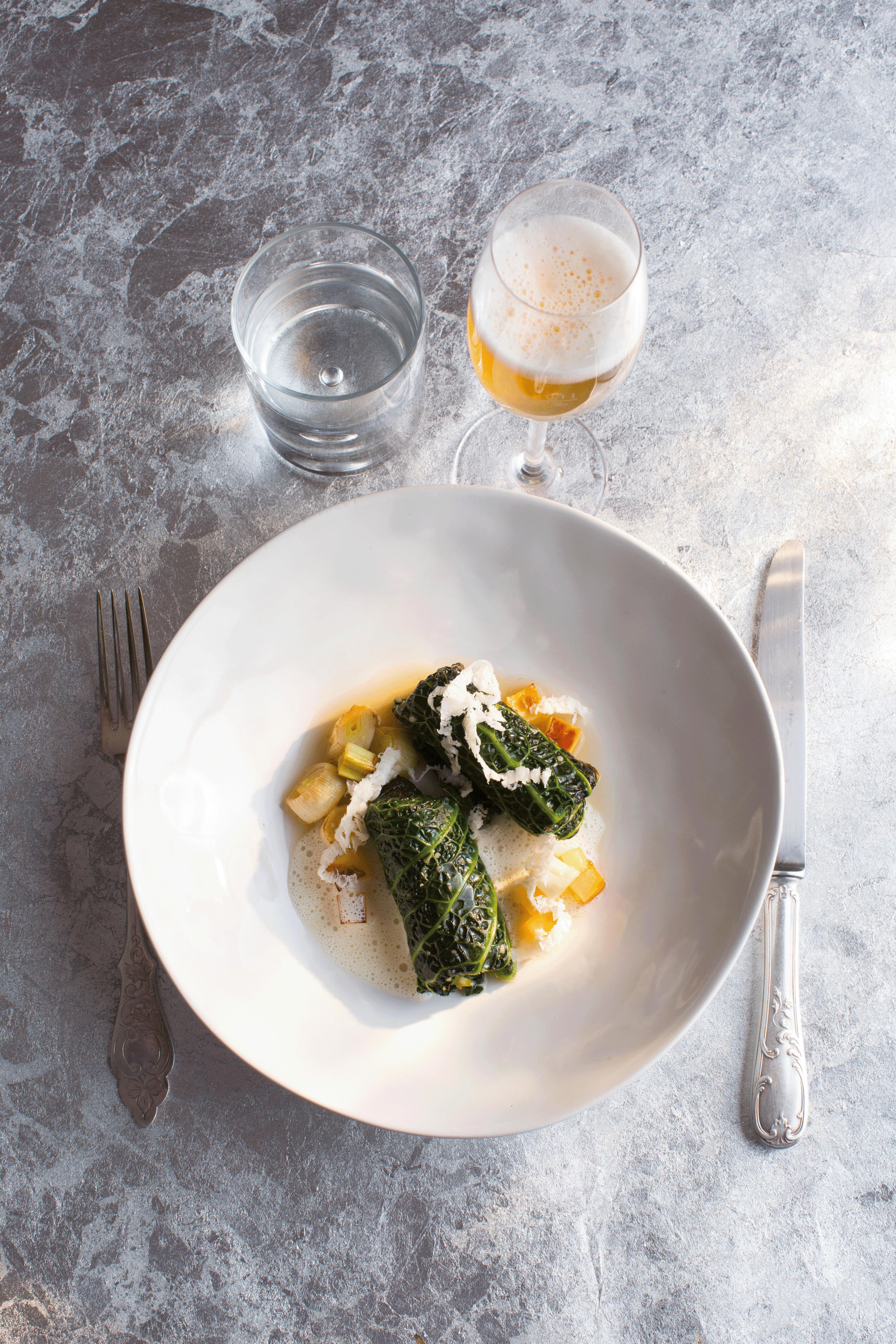 Umieścić krążki pora i kawałki ziemniaków w naczyniu żaroodpornym i zalać bulionem warzywnym. Dusić w piekarniku rozgrzanym do 180°C przez około 15 minut. Ułożyć na wierzchu roladki z kapusty i dusić przez kolejne 15 minut. Podlać raz lub dwa bulionem, który wytworzy się na patelni.