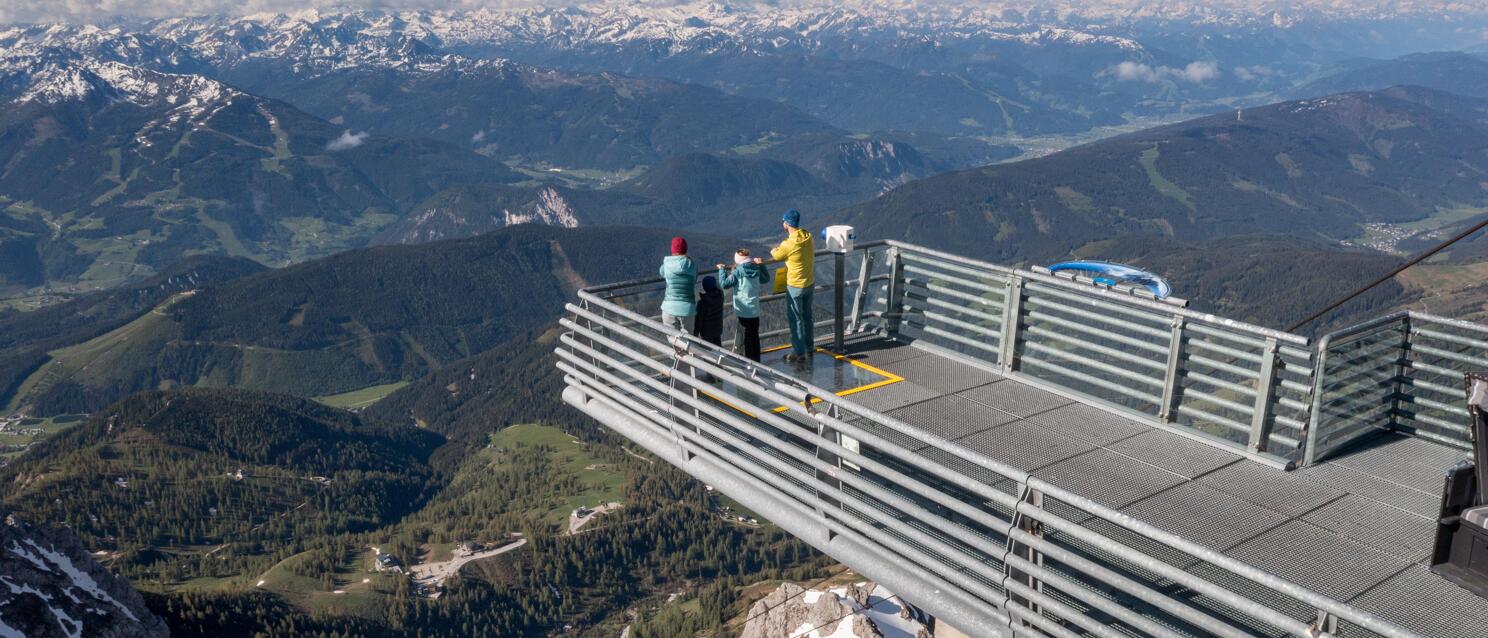 Vyhliadková plošina Dachstein-Skywalk sa nachádza vo výške 2 700 metrov nad morom a ponúka úchvatný 360° panoramatický výhľad. Takýto pohľad na svet sa vám často nenaskytne. Na obzore môžete rozoznať impozantné horské masívy: od Großglockneru – najvyššieho vrchu Rakúska s výškou 3 798 metrov – až po Hochkönig (2 941 metrov) a Großvenediger (3 666 metrov) tu nájdete všeličo. Aj pre tých najskúsenejších milovníkov hôr je to kulisa s wow efektom.