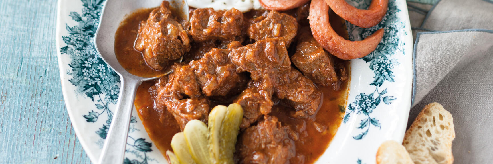 S týmto receptom sa vám guláš určite podarí a bude chutiť ako viedenský originál. Jeho tajomstvom sú suroviny na ozdobu: párky, volské oko a kyslé uhorky.
