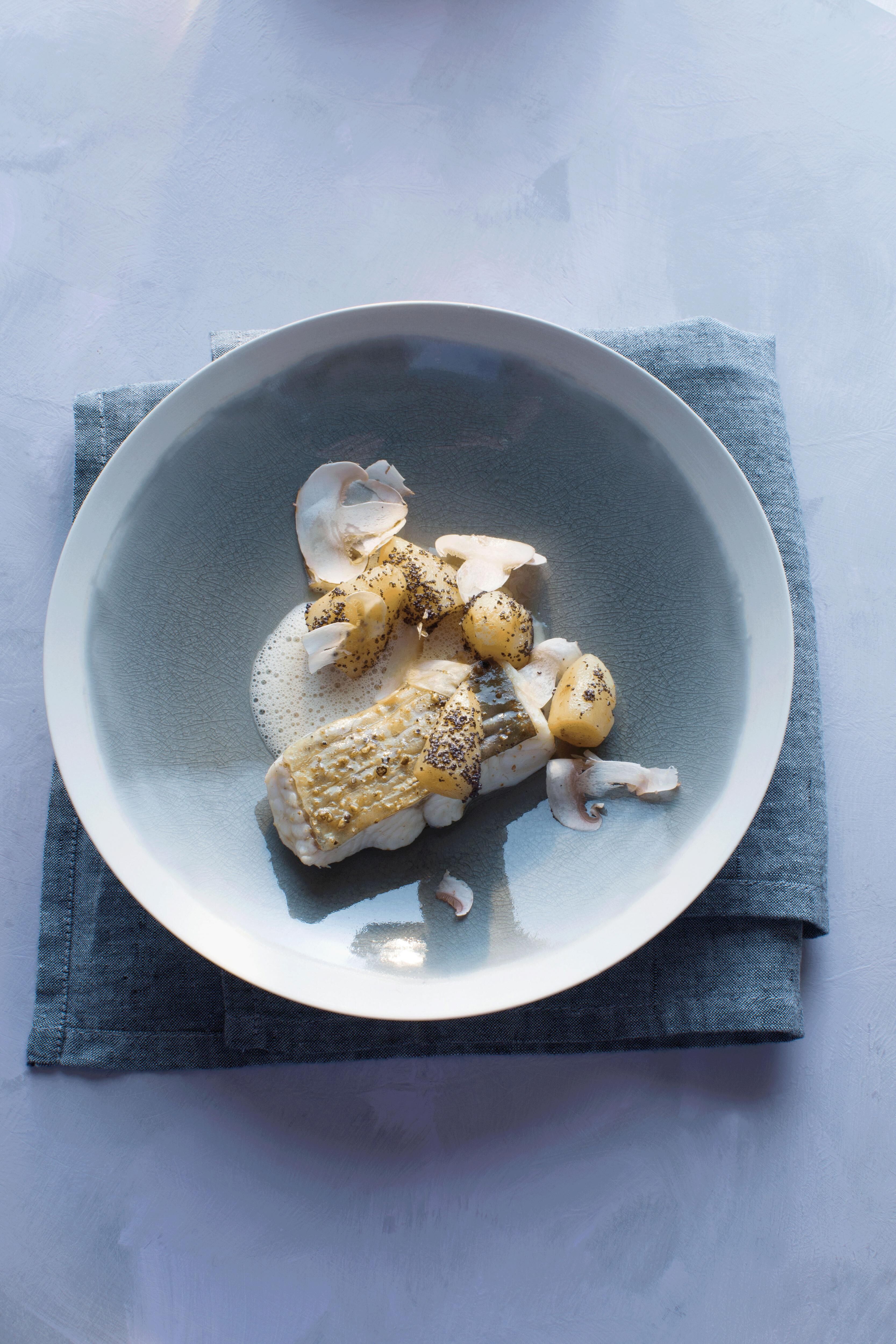 Servera kokt körvelrot med den ångkokta havskatten och svampskummet. Om så önskas kan färsk svamp rivas fint på toppen, t.ex. med en tryffelskivare.