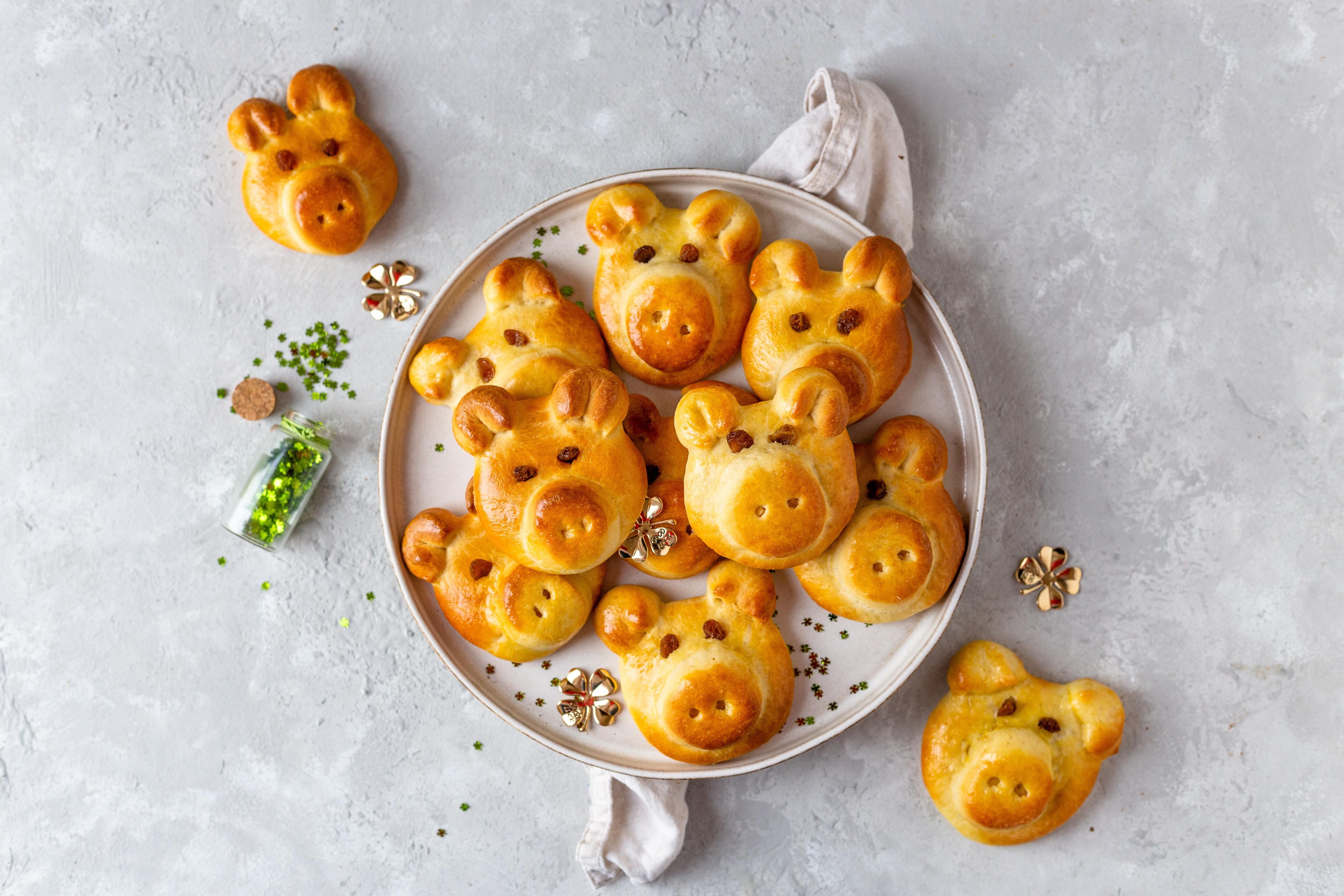 Ta ut lyckogrisarna ur ugnen och skär ut två ögon med ett sugrör över näsan och fyll med russin. Om du förbereder grisarna dagen innan kan du förvara dem i en lufttät behållare så att de håller sig fuktiga. De smakar bäst färska.
