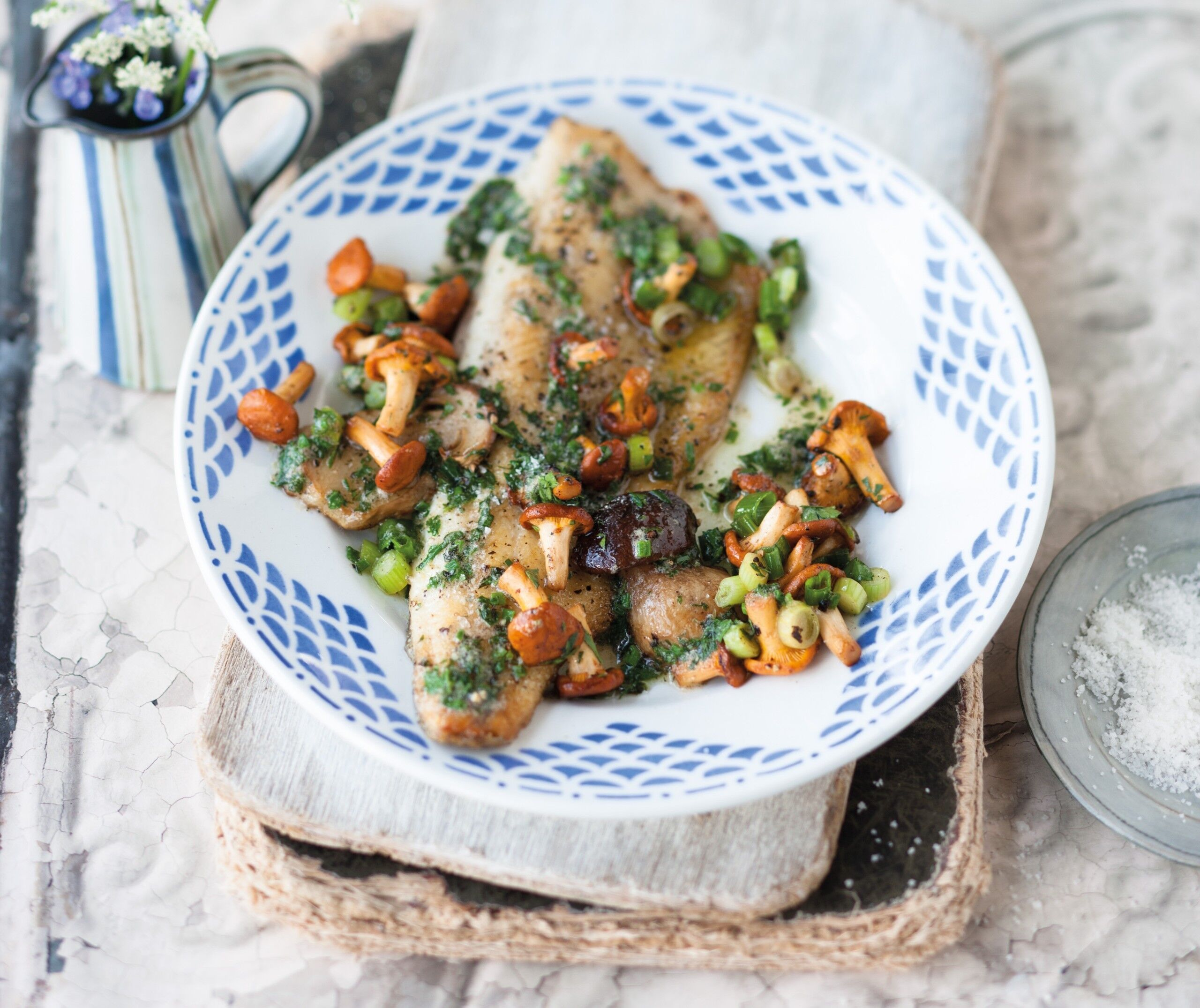 När svamparna har stekt klart, salta åter en gång till, strö över persilja och lägg upp på en tallrik. Lägg upp fisken bredvid svampen och servera.