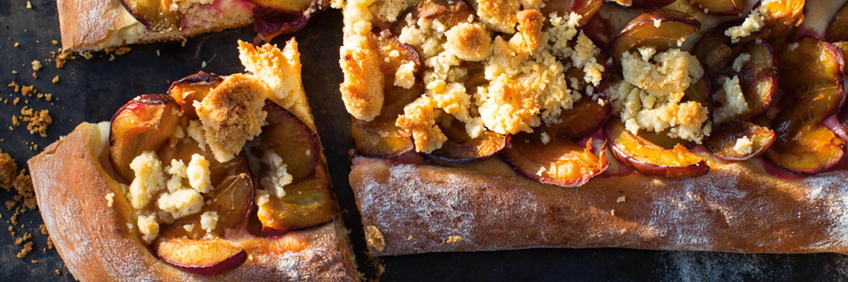 Sänk ugnen till 160 °C varmluft. Baka plommonkakan i 35 minuter. Efter 15 minuter, strö ut smulblandningen på en andra plåt med bakplåtspapper och grädda de sista 20 minuterna tills smulorna är gyllenbruna.